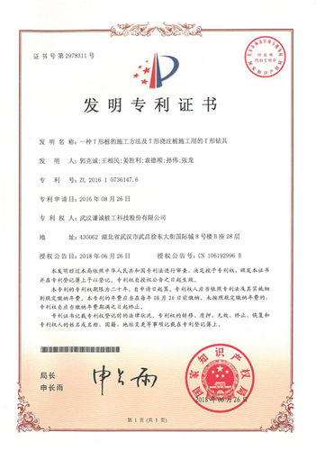 本站讯 谦诚桩工研发的“一种T形桩的施工方法及T形浇注桩施工用的T形钻具”于6月26日获得了国家知识产权局颁发的发明专利证书,专利号ZL201610736147.6,这是谦诚桩工2018年斩获的第三项专利。