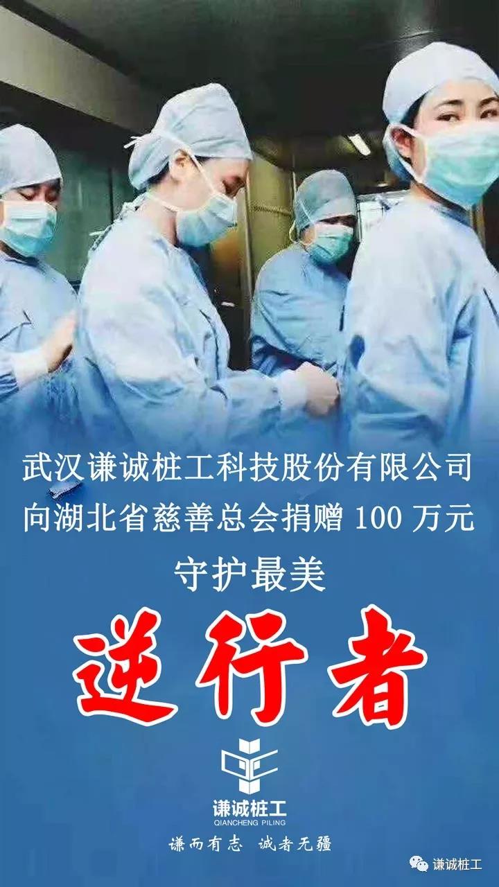 疫情的迅速蔓延,牵动着亿万同胞的心。作为一家有着高度社会责任感的武汉企业,谦诚桩工时刻关注疫情发展、勇担企业社会责任,于1月28日向湖北省慈善总会定向捐赠100万元,主要用于湖北省、武汉市中小定点医院医护人员的防护和保护工作。