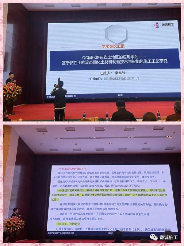 会上,公司总工办主任、岩土工程事业部副总工程师李常钦作题为《QC固化剂在软土地区的应用系列——基于黏性士的流态固化土材料制备技术与智能化施工工艺》的专题报告,重点宣讲了公司自主研发并先后获得中国交通运输学会科学技术一等奖、湖北省科技进步二等奖的海相淤泥专用固化剂及配套施工工艺,就该研发成果的工艺参数、技术优势及市场应用情况作了详细介绍。