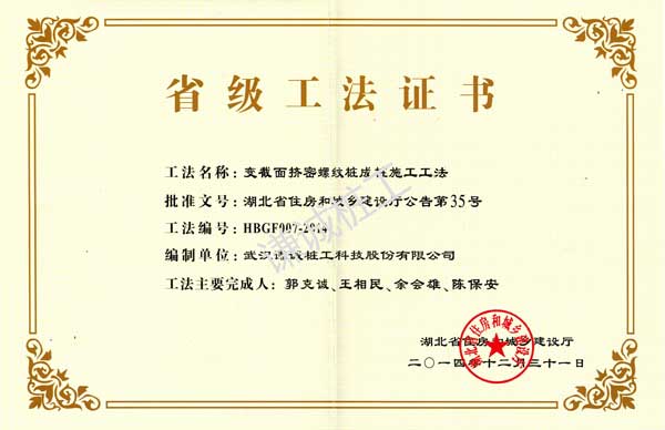 荣获“变截面挤密螺纹桩成桩施工工法”